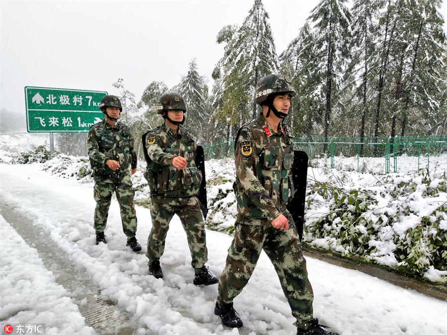Border policemen patrol along the snow-covered road in Mohe county, Northeast China's Heilongjiang province, August 28, 2017. [Photo/IC]
