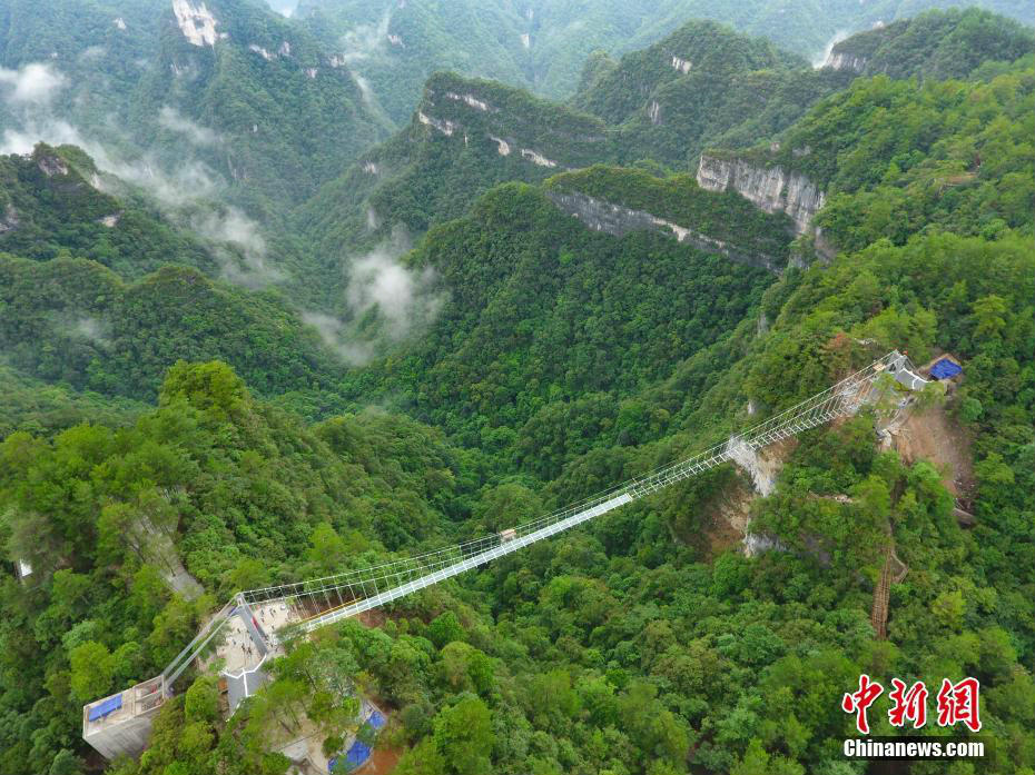 Aerial view of a skywalk made of glass at world heritage site Yuntaishan, southwest China's Guizhou Province, on August 28, 2017. The bridge is 190 meters long and 120 meters high, and opened to the public on Monday. [Photo: Chinanews.com]