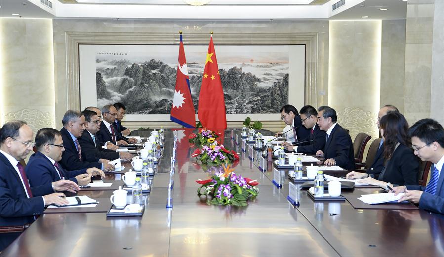 Chinese Foreign Minister Wang Yi holds talks with visiting Nepalese Deputy Prime Minister and Foreign Minister Krishna Bahadur Mahara in Beijing, capital of China, Sept. 7, 2017. (Xinhua/Zhang Ling)