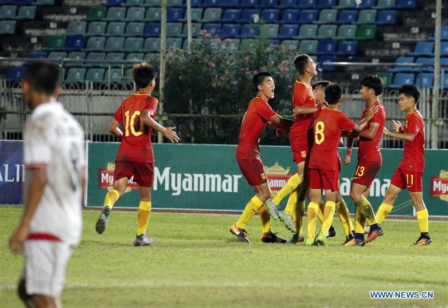 Players of China celebrate after scoring during the Asian Football Confederation (AFC) U16 Championship qualifiers Group H match between China and Myanmar at the Thuwana stadium in Yangon, Myanmar, Sept. 25, 2017. China won 2-1. (Xinhua/U Aung)