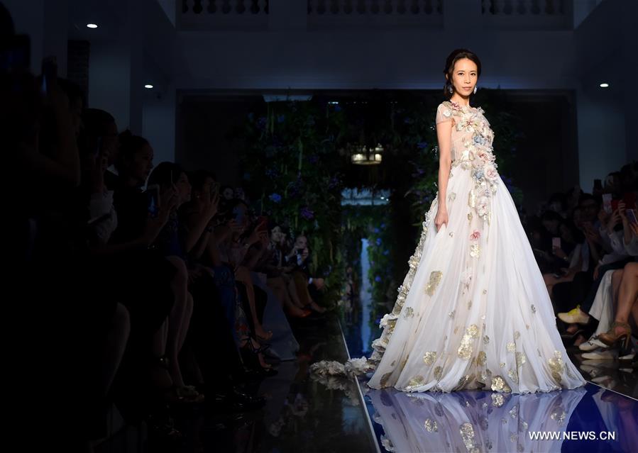 Singer Karen Mok presents a creation during Guo Pei's Haute Couture fashion show in Beijing, capital of China, Sept. 27, 2017. (Xinhua/Luo Xiaoguang)