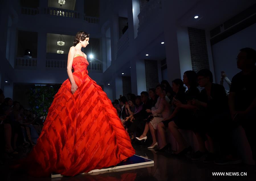 A model presents a creation during Guo Pei's Haute Couture fashion show in Beijing, capital of China, Sept. 27, 2017. (Xinhua/Luo Xiaoguang)