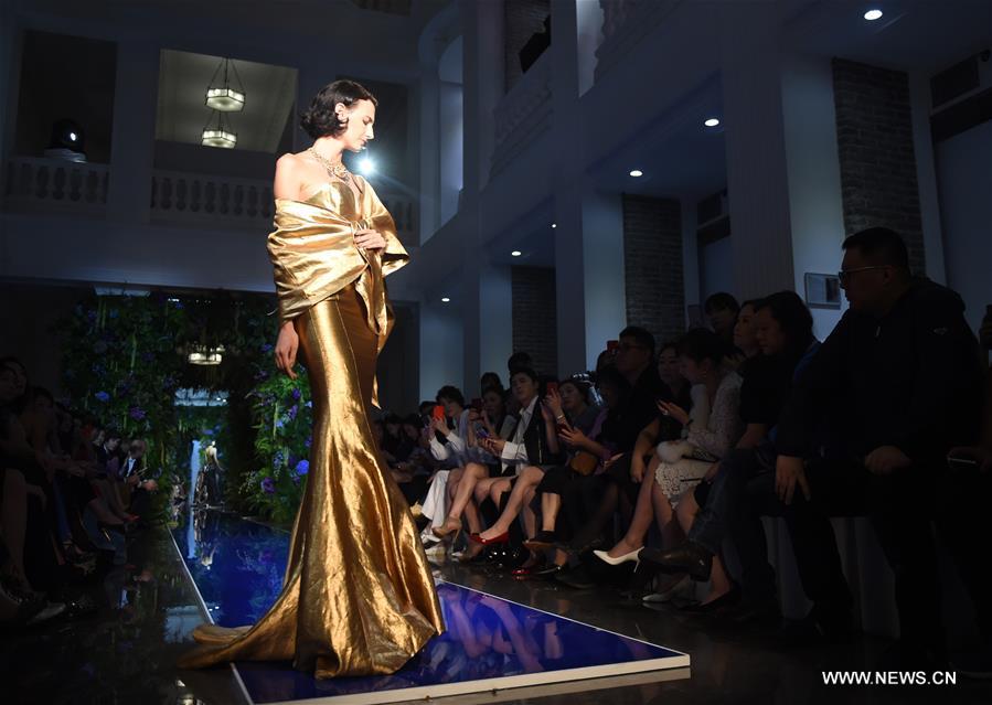 A model presents a creation during Guo Pei's Haute Couture fashion show in Beijing, capital of China, Sept. 27, 2017. (Xinhua/Luo Xiaoguang)