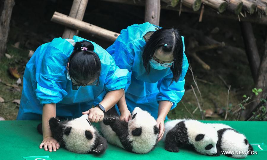 Photo taken on Sept. 29, 2017 shows giant panda cubs and their keeper at Chengdu Research Base of Giant Panda Breeding in Chengdu, capital city of southwest China's Sichuan Province. A total of 10 cubs born in the base in 2017 met the public here Friday. (Xinhua/Xue Yubin)