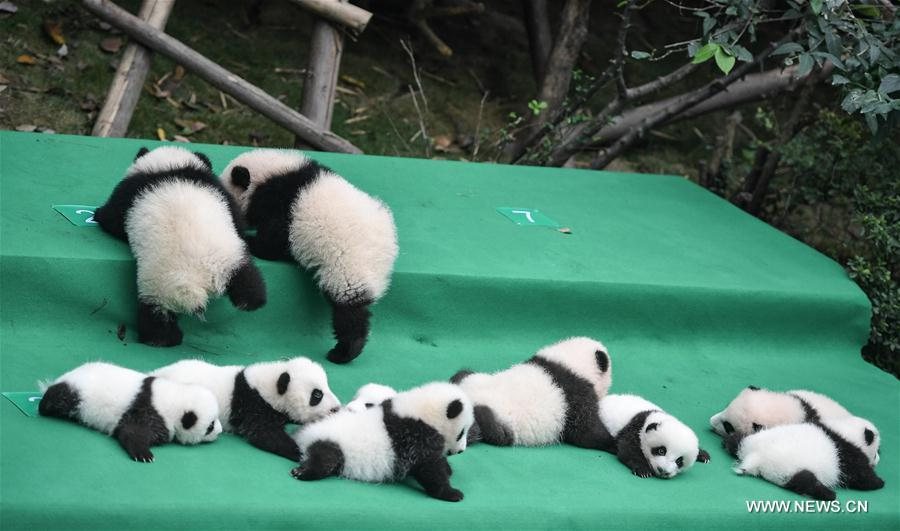 Photo taken on Sept. 29, 2017 shows giant panda cubs at Chengdu Research Base of Giant Panda Breeding in Chengdu, capital city of southwest China's Sichuan Province. A total of 10 cubs born in the base in 2017 met the public here Friday. (Xinhua/Xue Yubin)