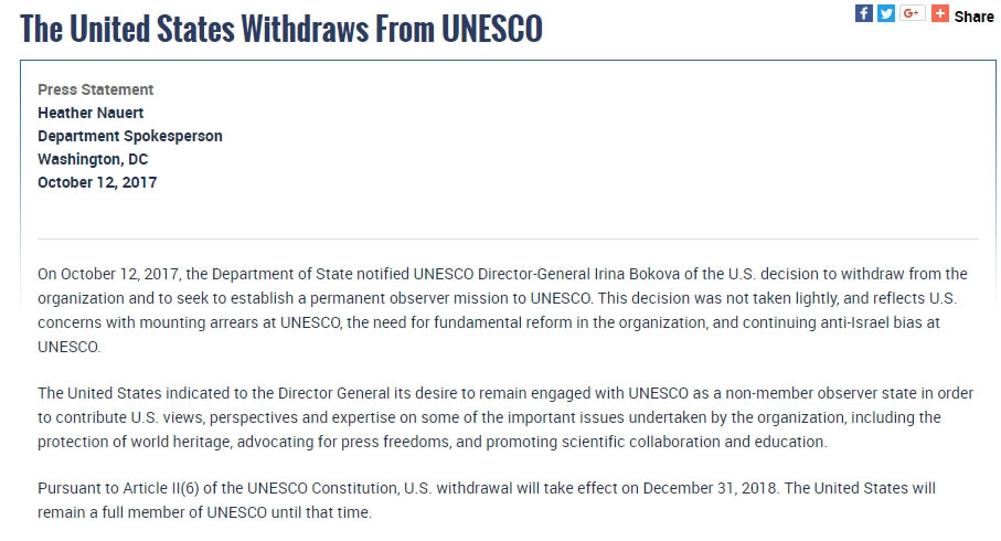UNESCO’s outgoing director-general, Irina Bokova of Bulgaria, called the US departure a loss for “the United Nations family” and for multilateralism. She said the US and UNESCO matter to each other more than ever now to better fight “the rise of violent extremism and terrorism.”