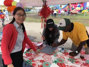 Students try Chinese calligraphy at the University of the South Pacific’s (USP) on Sept 11, 2017. [Photo: USP]