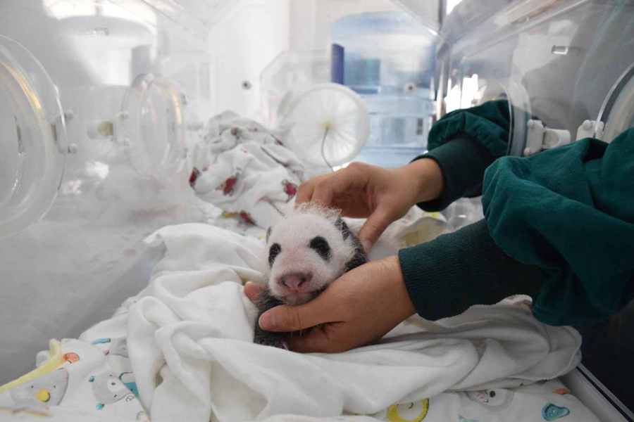 A breeder is checking physical condition of the new-born panda cub. (Photo by CCRCGP)