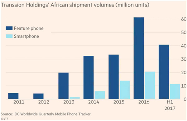 Transsion is expected to sell 120 million of its handsets to 41 countries this year, according to media estimates.