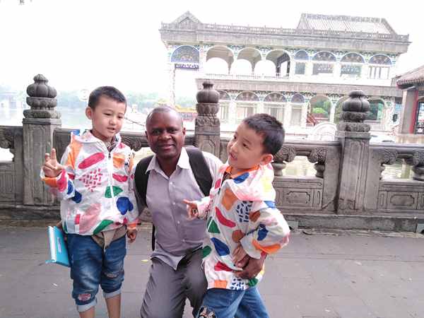Kimeng Hilton Ndukong, journalist from Cameroon, poses with a set of Chinese twins during a visit to the Summer Palace in Beijing. Photo by Getachew Yalew