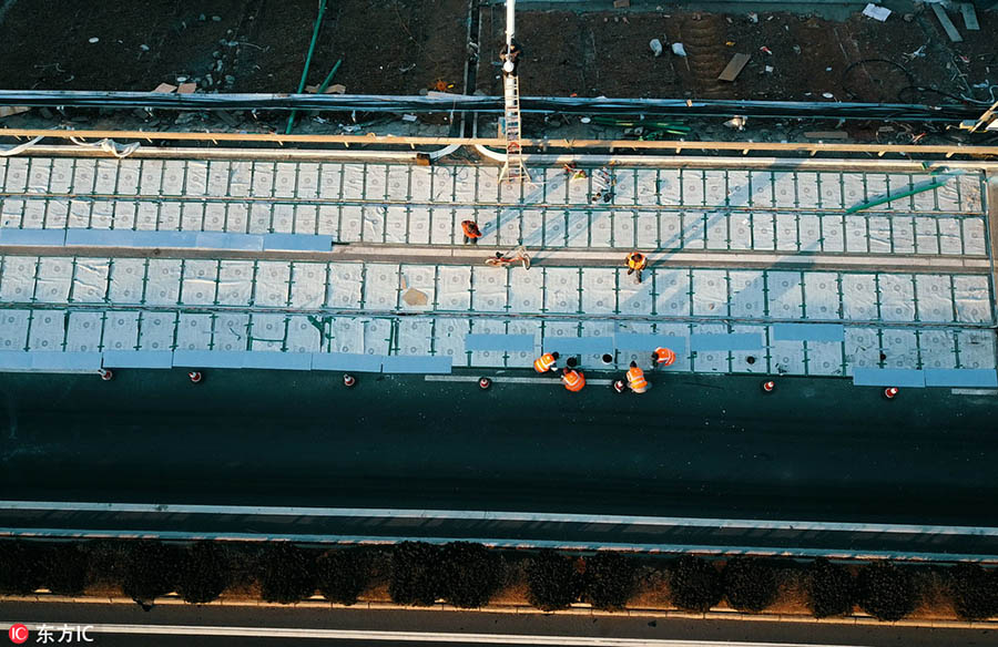 In the southern section of Jinan’s urban beltway, workers paved the photovoltaic road and placed solar power batteries under the white grids on Dec 13.