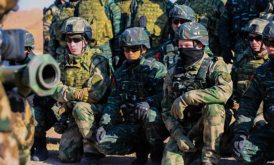 Participating soldiers stand and await orders after arriving at a designated training base during the second day's joint training of the "Cooperation-2017" joint anti-terrorism training between the Chinese People's Armed Police Force (APF) and Russian Federation National Guard on December 4, 2017. (eng.chinamil.com.cn/Photo by Wang Huawei, Wang Tao and Zhou Huancheng)