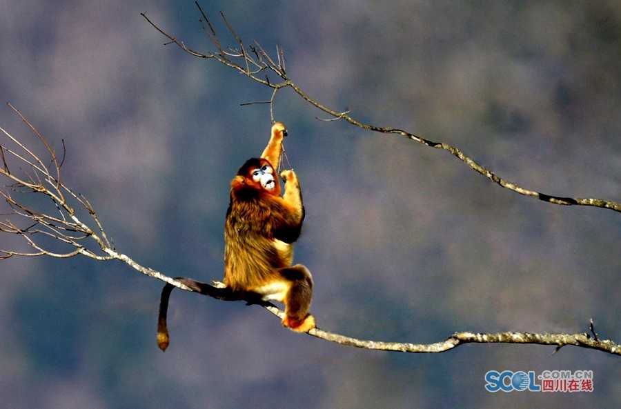 Golden snub-nosed monkeys were spotted on Tuesday looking for food and playing on trees some 100 meters from a village in Baoxing County, Ya’an City, southwest China’s Sichuan province. The monkeys left their mountain habitat to look for food after heavy snow.