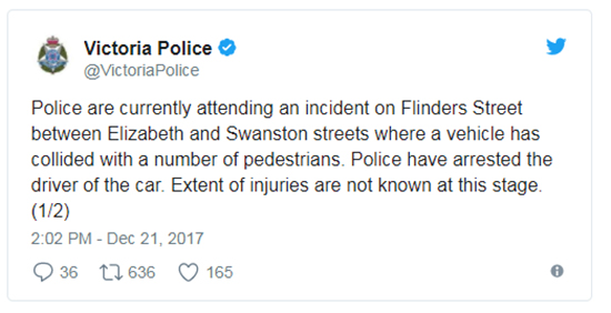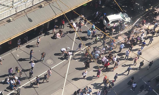 Victorian police say a vehicle has collided with a number of pedestrians on Flinders Street between Elizabeth and Swanston streets. (Photo: Twitter)