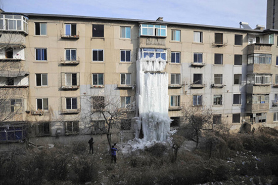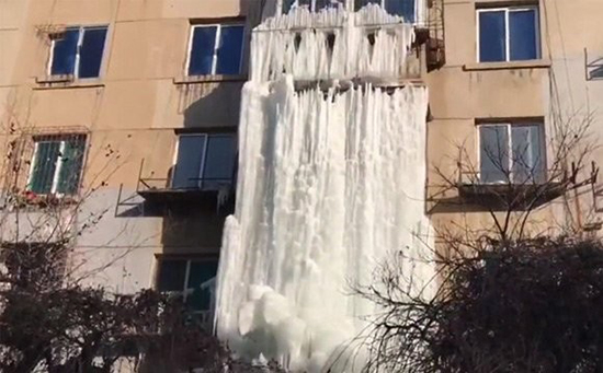 Photos of a 10-meter frozen waterfall that covers four floors of an abandoned residential building have gone viral. Authorities said the building was abandoned in October. Broken water pipes were exposed directly to the cold weather. The lowest temperature in Anshan in winter is under -10℃.