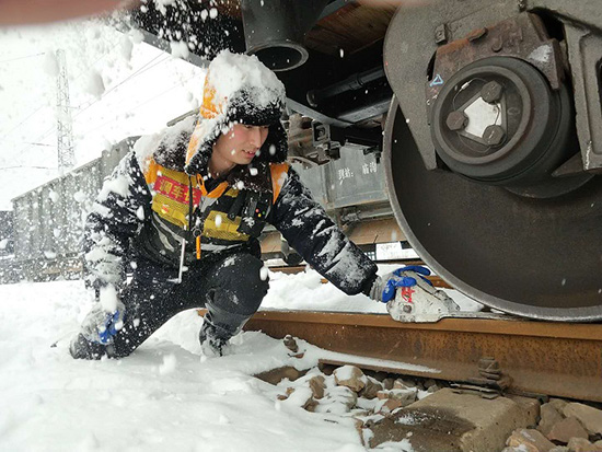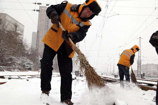 As heavy snowfall hit many parts of central and eastern China on January 4, workers at Luoyang Locomotive Depot of China Railway's Zhengzhou Group wrapped sandpipes with plastic bags to avoid freezing.