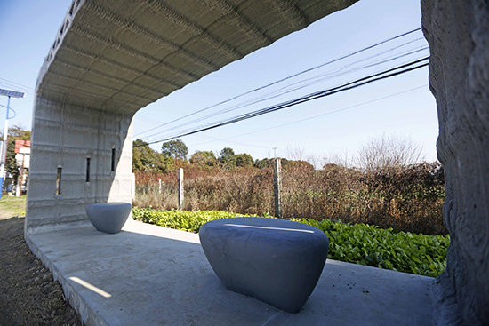 The 3D-printed bus shelters have a unique closed loop design, and two round stools are set inside the gray rectangle frame. The original print marks still remain, allowing observers to see how the structure was made layer-by-layer.