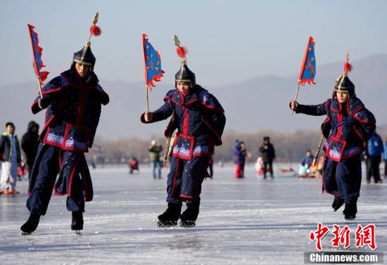 Performers in different colors skate on ice in Summer Palace/ Du Yang from Chinanews.com