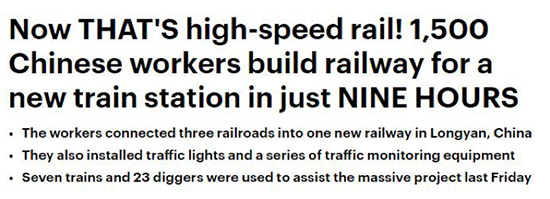 Daily Mail Online reported: “Now that’s high-speed rail! 1,500 Chinese workers build railway for a new train station in just NINE HOURS.” The report immediately became an online hit and was forwarded over 8,000 times by foreign net users in several hours after it was published.