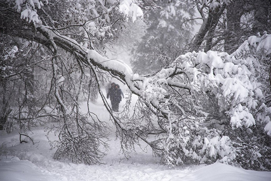 People walk next to a fallen branch due to heavy snowfall on a tree in the Botanical Garden in Moscow, Russia, Sunday, Feb. 4, 2018. (Photos: AP)