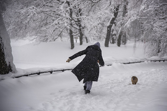 A woman walks her pet in the Botanical Garden during a heavy snowfall in Moscow, Russia, Sunday, Feb. 4, 2018.