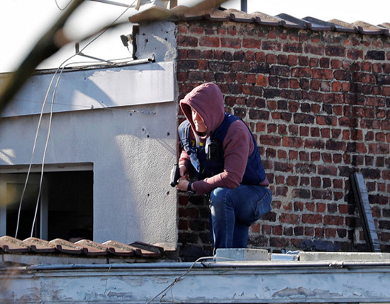 A Belgian police officer prepares his gun while taking a position on a roof. (Reuters)