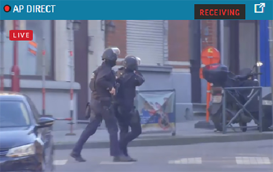 Images from the scene showed heavily armed police hiding behind buildings and scouting the rooftop of a building in the Forest district of the Belgian capital. A police helicopter could be heard overhead. The police response began at around lunchtime.