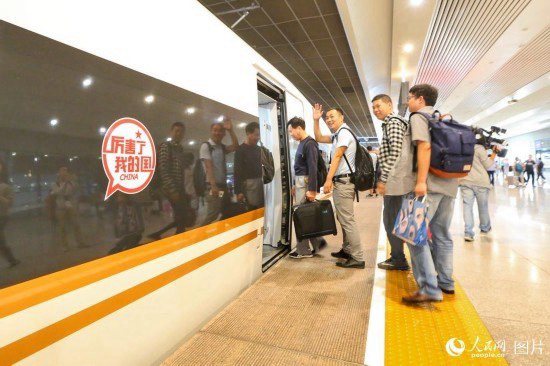 The first batch of passengers get on the Fuxing bullet train on Sept. 21, 2017 when seven pairs of trains start running between Beijing and Shanghai at the speed of 350 kilometers per hour. (Photo by Wang Chu from People’s Daily Online)