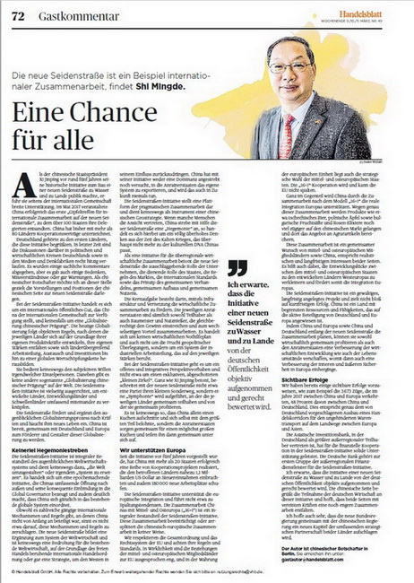 Berlin (People's Daily) - The Belt and Road (B&R) initiative is “an opportunity for all parties to cooperate,” said Shi Mingde, the Chinese ambassador to Germany, in an article he penned for Germany’s leading business newspaper Handelsblatt published on Friday.