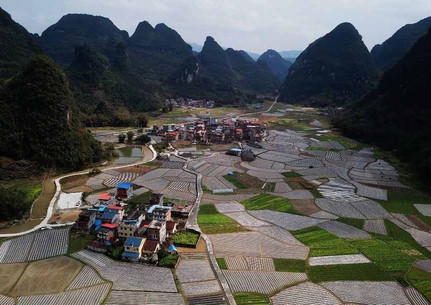 An aerial photo taken on March 4, 2018 shows village roads running through the fields, houses and mountains in Luocheng Mulao Autonomous county, southern China’s Guangxi Zhuang Autonomous Region, making up a unique scene in the spring. (Photo by Meng Zengshi from CFP)