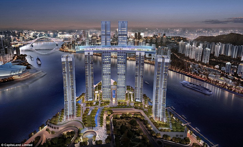 The humongous complex, called Raffles City Chongqing, is invested by Singaporean real estate company CapitaLand which owns a chain of shopping malls and office buildings across China.