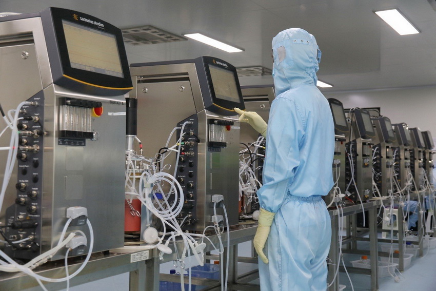 A researcher works on new medicine product at a bio-pharmaceutical enterprise based in Yantai, eastern China’s Shandong province on Aug. 9, 2017. (Photo by CFP)