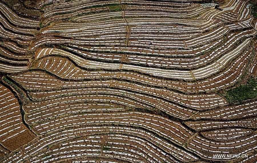 Aerial photo taken on March 20, 2018 shows the spring view of fields at Sanzhang Village of Delong Township in Napo County, south China's Guangxi Zhuang Autonomous Region. (Xinhua/Zhang Ailin)