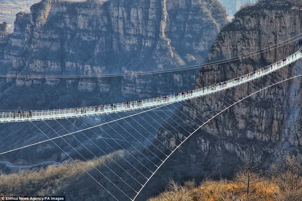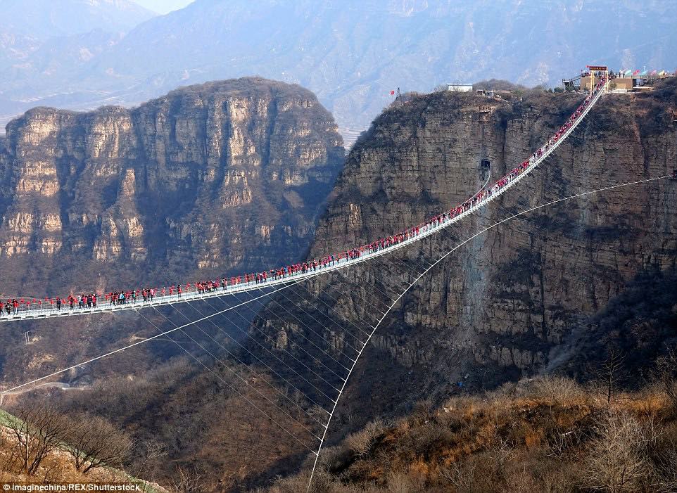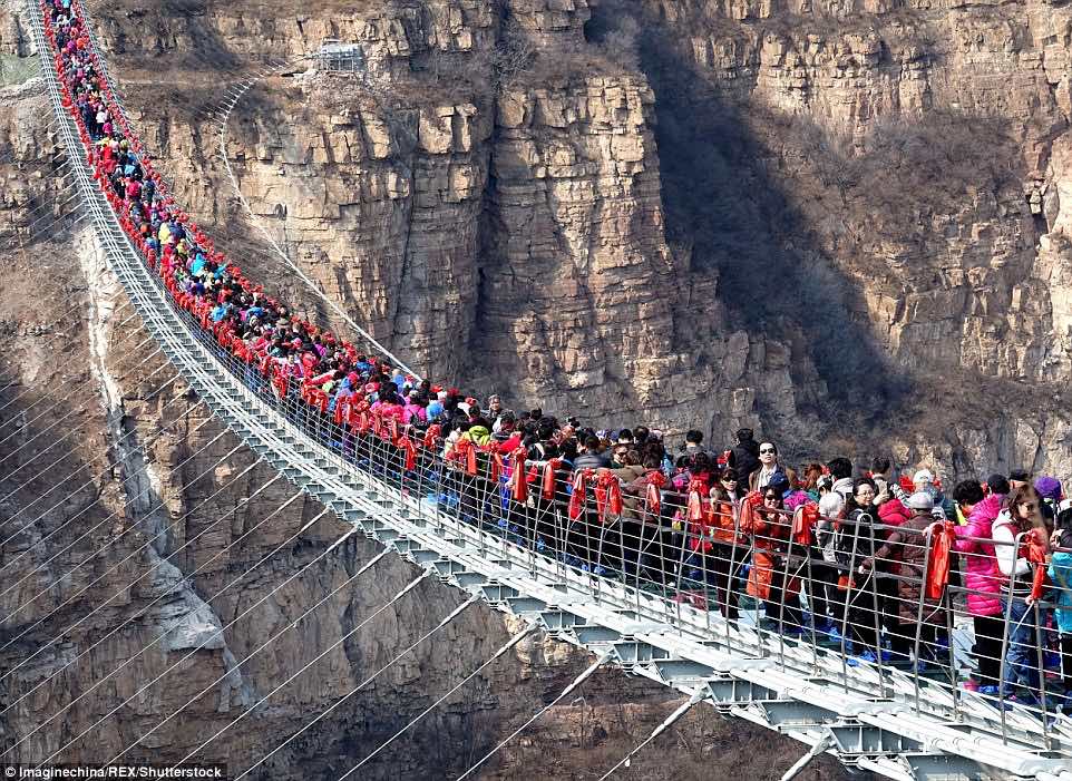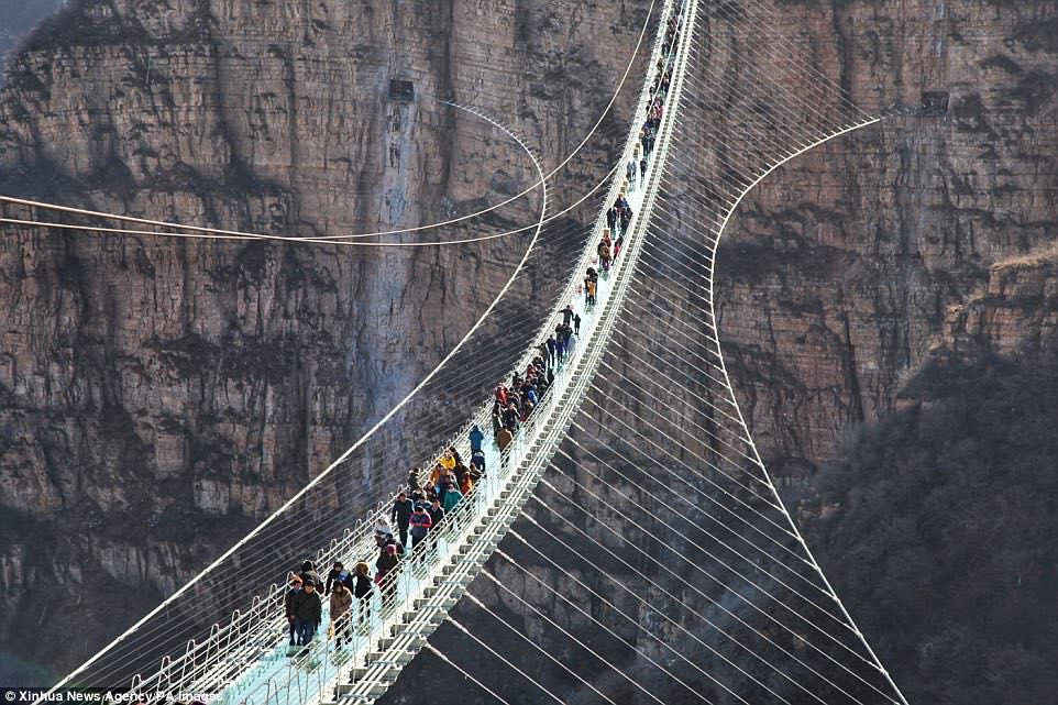 Daredevils: Tourists jump on the transparent suspension bridge which has been designed to sway 755 feet above the ground