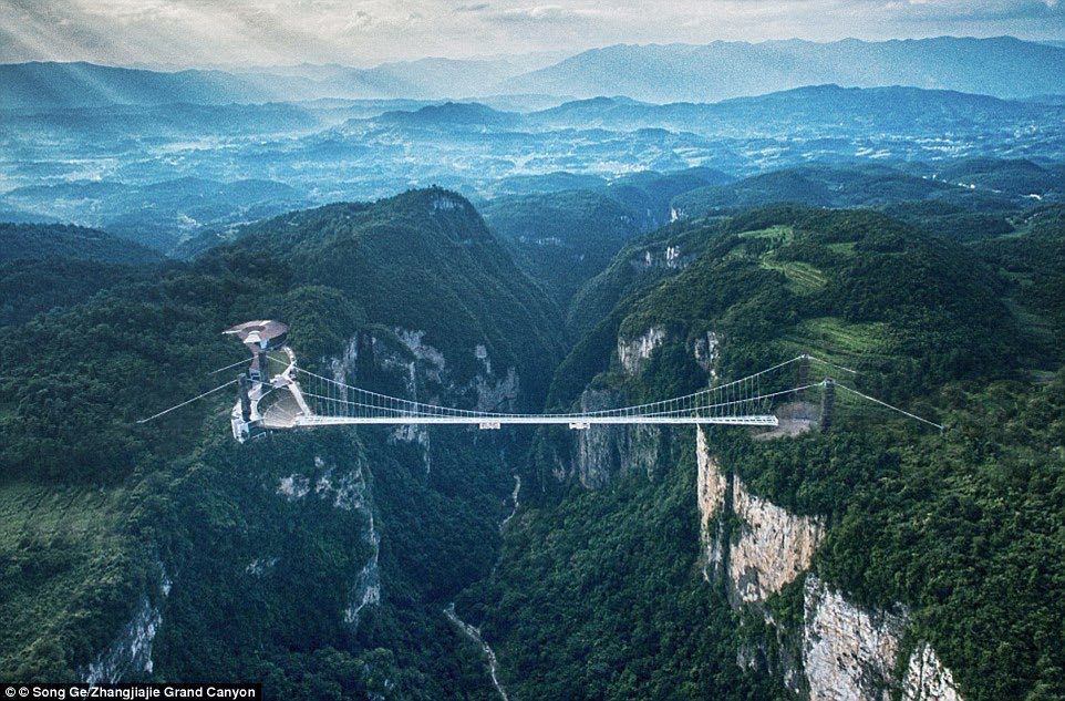 Spectacular: The bridge, weighing 70 tonnes, is suspended between to cliff faces and paved with 1,077 glass panels