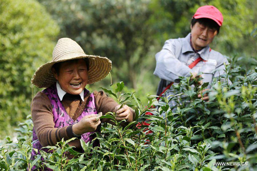 Farmers pick tea leaves at a tea garden in Changling Village of Zigui County, central China's Hubei Province, April 4, 2018. (Xinhua/Wang Huifu)