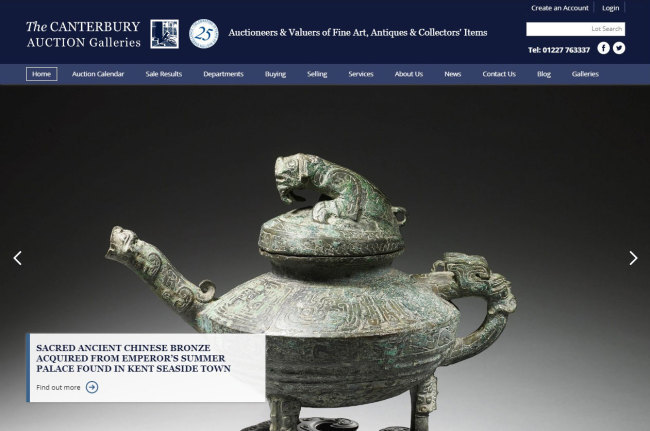 Screenshot of the Canterbury Auction Galleries' website with a picture of the Tiger Ying. [Photo: China Plus]