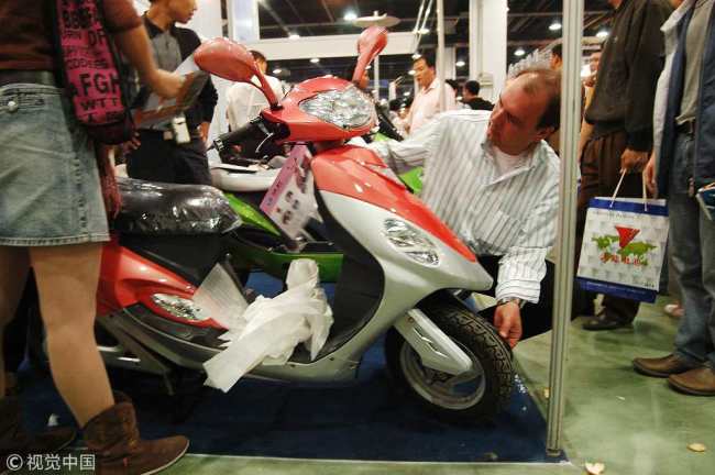 A European trader checks an electric bike at an exhibition in Hangzhou, Zhejiang Province. [File photo: VCG]