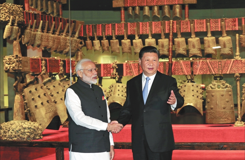 President Xi Jinping and Indian Prime Minister Narendra Modi visit an exhibition of fine relics, including a set of Chinese chimes, at the Hubei Provincial Museum on Friday. XU JINGXING / CHINA DAILY
