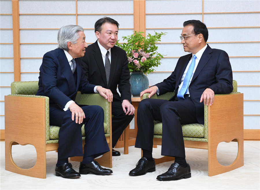 Premier Li Keqiang engages in conversation on Thursday with Japan's Emperor Akihito (left) at the Imperial Palace in Tokyo. He said he hoped bilateral ties improve. It was the first time a Chinese premier has met with the emperor since June 2010. Akihito said he hopes "our relations of goodwill and friendship will improve", according to the royal household. [Photo/Xinhua]