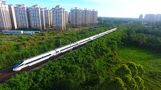Photo taken on May 6, 2018 shows a bullet train running on the high-speed loop line near Qionghai city, South China's Hainan province. The 653-km high-speed railway line circling the island received over 25 million passengers in 2017. [Photo/Xinhua]