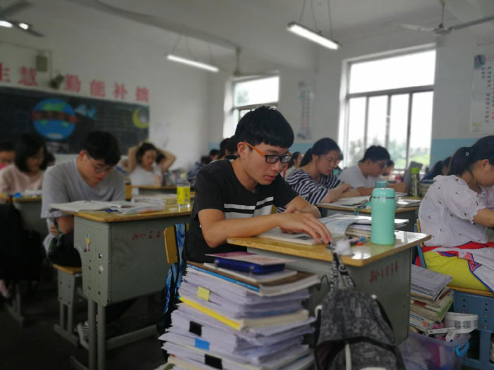 Tang Yan (center) of Huanggang Middle School reviews his lessons before the upcoming national college entrance exams. (Photo: Li Hongmei/Huanggang Middle School)