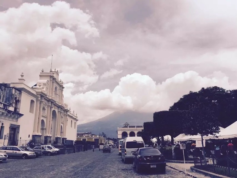 A corner of Antigua city, and Fuego Volcano embraced by clouds. (Photos: Li Lei\People's Daily)