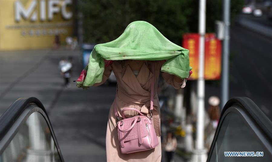 A woman uses clothes to prevent direct sunshine in Tianjin, north China, June 5, 2018. The temperature here broke through 40 degrees celsius on Tuesday. (Xinhua/Li Ran)