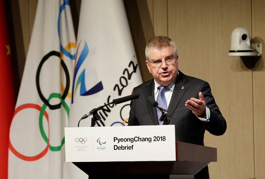 President of the International Olympic Committee (IOC) Thomas Bach speaks at an official debrief to share experience from Pyeongchang 2018, at the headquarters of the Beijing Organizing Committee for the 2022 Olympic and Paralympic Winter Games (BOCOG) in Beijing, June 4, 2018. [Photo/Agencies]