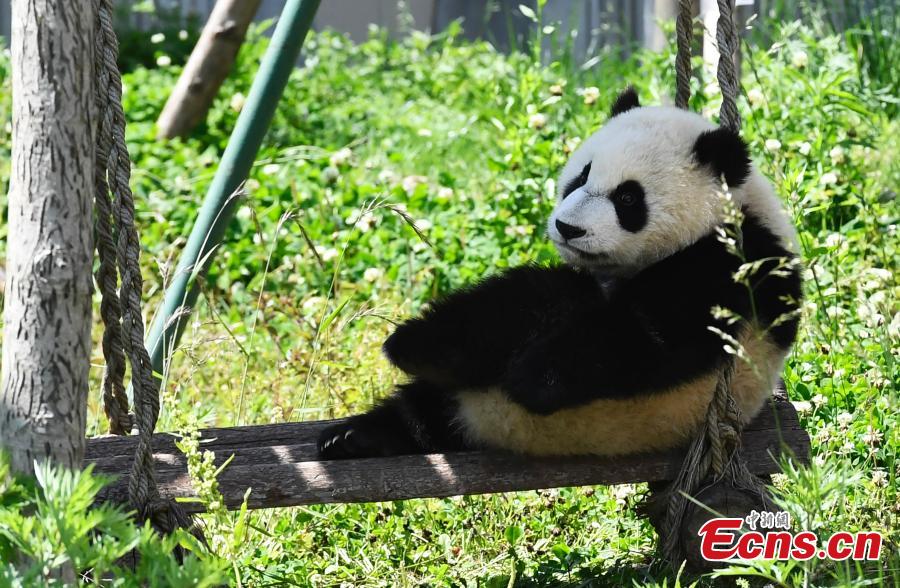 Photo taken on June 10, 2018 shows a giant panda born this year at the China Conservation and Research Center for the Giant Panda plays on a sunny day. (Photo: China News Service/An Yuan)
