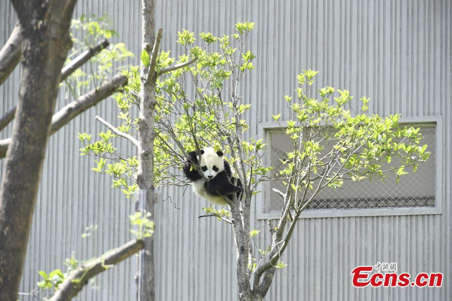Photo taken on June 10, 2018 shows a giant panda born this year at the China Conservation and Research Center for the Giant Panda plays on a sunny day. (Photo: China News Service/An Yuan)