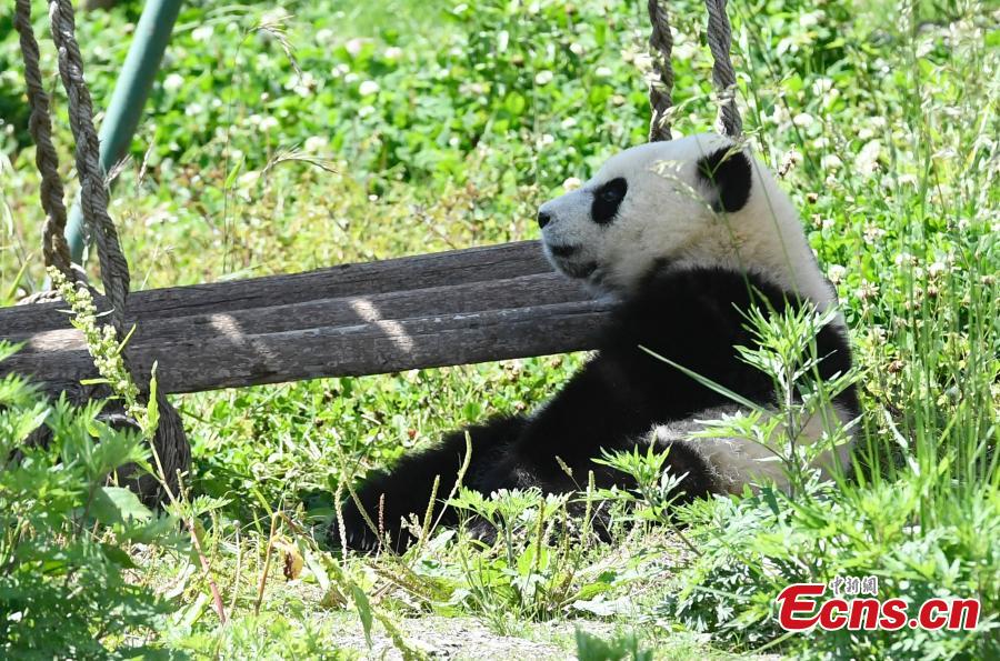 Photo taken on June 10, 2018 shows a giant panda born this year at the China Conservation and Research Center for the Giant Panda plays on a sunny day. (Photo: China News Service/An Yuan)