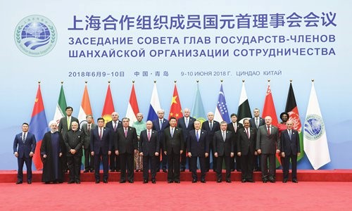 Chinese President Xi Jinping (center) welcomes foreign leaders to the 18th Shanghai Cooperation Organization (SCO) summit and has photos taken with them on Sunday in Qingdao, East China's Shandong Province. Photo: Xinhua