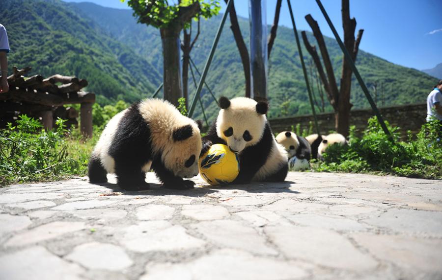 Pandas show off their soccer skills at the China Conservation and Research Center for Giant Panda in Southwest China's Sichuan Province on June 10 ahead of the FIFA World Cup. (Photo/Courtesy of the China Conservation and Research Center for Giant Panda)